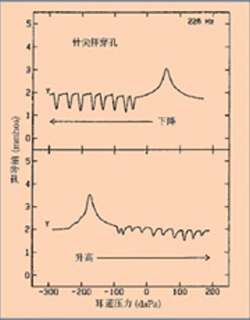 上圖為壓力從正到負變化,峰值出現在正向。下圖為壓力從負到正變化,峰值出現在負向。兩鼓室圖中鋸齒狀的尾部表示在鼓膜針尖樣穿孔的邊緣,壓力出現波動。