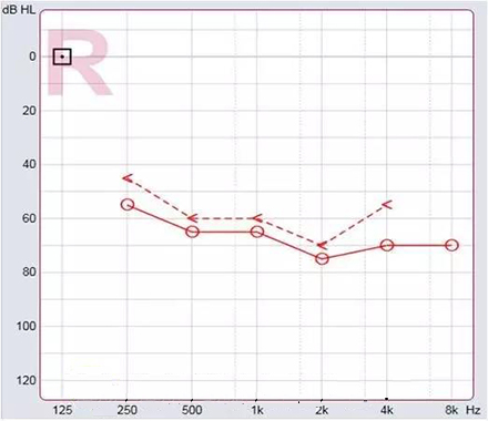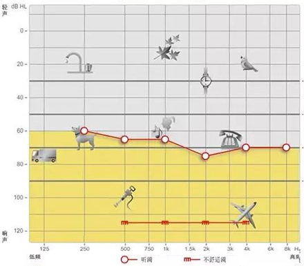 純音測試聽力圖的橫坐標為頻率,從左至右表示測試聲的頻率從低到高,即125Hz至8000Hz;縱坐標為強度,從上至下表示受試者能聽到的最小的聲音強度,以dBHL為單位。如下圖所示:</p><p> </p><center><img alt="" src="/upfiles/201903250213137760.png" width="440" height="400" /></center><p></p><p> 聽力圖的畫法自從1943年在C.C.Bunch的著作中出現后,至今沒有改變。通常右耳的測試結果用紅色表示,左耳用藍色。下圖是ASHA(1990)建議使用的各種標記符號,這些符號已在世界各地廣泛使用。</p><p> </p><center><img alt="" src="/upfiles/201903250213216822.png" width="440" height="250" /></center><p></p><p> 純音測試的測試項目有氣導、骨導、舒適閾與不舒適閾。那么這簡簡單單的聽力圖在驗配過程中有哪些重要作用呢?</p><p> 1、確定聽力損失程度</p><p> 按照世界衛生組織(WHO)1997年的標準,根據0.5kHz、1kHz、2kHz、和4kHz氣導平均聽閾值,將聽力損失分為輕度、中度、重度和極重度。</p><p> </p><center><img alt="" src="/upfiles/201903250213312187.png" width="440" height="180" /></center><p></p><p> 世界衛生組織(WHO-1997)的聽力障礙分級標準</p><p> 舉例</p><p> 下圖為某一聽力損失者所測得的聽力圖</p><p> </p><center><img alt="" src="/upfiles/201903250213367902.png" width="440" height="380" /></center><p></p><p> 0.5kHz的聽閾為65dBHL,1kHz的聽閾為65dBHL,2kHz的聽閾為75dBHL,4kHz的聽閾為70dBHL。則平均聽閾為(65+65+75+70)/4=68.75。將68.75dBHL代入以上分級表格,得到該聽力損失者的損失程度為重度。 聽力損失程度的確定有利于確定助聽器的功率。</p><p> 2、判斷聽力損失性質</p><p> 根據氣導、骨導的關系,可將聽力損失分為傳導性聽力損失、感音神經性聽力損失及混合性聽力損失。</p><p> 骨導與氣導之差大于10dB,且骨導在正常范圍內為傳導性聽力損失,表明聽力下降是由外耳、中耳病變引起。</p><p> 氣骨導一致(≤10dB)且都在正常范圍之外為感音神經性聽力損失。表明聽力下降是由耳蝸、聽神經損傷引起。</p><p> 骨導與氣導之差大于10dB,但骨導在正常范圍之外為混合性聽力損失,表明以上兩種聽力損失均有,由上述多種部位病變引起聽力下降。確定聽力損失性質還需結合臨床表現,也有助于助聽器佩戴效果的預測。</p><p> 3、解釋聽力損失者的日常生活困難</p><p> 聽力損失者在日常生活中經常遇到的問題有1)時而聽得到,時而聽不到;2)聽得到,聽不清;3)小聲聽不到,大聲受不了。</p><p> 時而聽得到時而聽不到</p><p> 以下圖平坦型聽力曲線為例,當周圍言語聲高于其聽閾,即處于曲線下方區域時,該聽力損失者能聽到;當周圍言語聲低于其聽閾,即處于曲線上方區域時,聽力損失者則聽不到對方的說話聲。此為“時而聽得到,時而聽不到”。</p><p> </p><center><img alt="" src="/upfiles/201903250213445950.png" width="440" height="340" /></center><p></p><p> 聽得到 聽不清</p><p> 中文漢語元音輔音的頻率及響度有其分布圖,如下圖所示。以陡降型聽力曲線為例,該聽力損失者聽不到大部分的輔音。聽得清不清楚,主要取決于高頻輔音聽得到聽不到。例如該聽力損失者“g”、“ch”聽不到,但“u”能聽到,因此,他會將“姑姑”、“出租”都聽成“uu”。聽不清楚時,再結合口型,前后句的冗余度猜測。猜對則談話繼續,猜錯則打岔。兒童聽力曲線若是如此,長期接收不正確的語音,會出現口齒不清。</p><p> </p><center><img alt="" src="/upfiles/201903250213526855.png" width="440" height="340" /></center><p></p><p> 小聲聽不到 大聲受不了</p><p> 小聲聽不到,大聲受不了是重振現象。以下圖聽力曲線為例,“飛機”處于不舒適閾附近,聽力損失者對“飛機”的聲音聽著受不了。另外,該聽力損失者聽不到“手表”等聲音。</p><p> </p><center><img alt="" src="/upfiles/201903250214013300.png" width="440" height="385" /></center><p></p><p> 為了更好地使聽力損失者家屬明白聽力損失者的困難,目前有較多的工具可以模擬聽力損失狀態下的溝通與交流。</p><p> </p><center><img alt="" src="/upfiles/201903250214075950.png" width="440" height="370" /></center><p></p><p> 比如,在聲音樣本中選擇“餐廳”,并選擇“正常”,可聽到正常聽力者在“餐廳”環境中聽到的聲音;若選擇“患者”,則可使聽力正常者聽到聽力損失者聽到的聲音,令聽力正常者親身體驗他們所處的“模糊世界”。</p><p> 在“典型聽力圖”中,有“輕度”、“中度”、“重度”、“極重度”、“陡降型聽力”等選項,若選擇“重度”,則可體驗重度聽力損失者所聽到的聲音。</p><p> 4、調試</p><p> 聽力圖在助聽器驗配調試過程中也起著非常重要的作用。</p><p> 首次驗配</p><p> 助聽器處方公式結合聽力圖計算出聽力損失者的目標增益,為驗配師的進一步調節奠定了基礎。聽力圖結果越準確,首次驗配的滿意度越高。</p><p> 調試</p><p> 在助聽器調試過程中,不能忽視聽力圖的作用。舉一實例:下圖為某助聽器佩戴者的聽力圖,經過多次降低高頻增益,仍反應聲音刺耳。通過對聽力圖的觀察,該佩戴者2kHz處的聽閾較高,且2kHz處的增益亦較多。將2kHz處的增益降低后,助聽器佩戴者的滿意度提高。</p><p> 讀懂聽力圖是驗配助聽器過程中非常重要的一環,只有讀懂聽力圖并解釋清楚聽力圖,對成功驗配助聽器可達到事半功倍的效果。在助聽器驗配調試環節,亦不能忽視聽力圖。聽力圖在整個助聽器驗配過程中起到不可替代的作用。</p><p> 更多詳情請登錄聽覺有道助聽器www.milwaukeetvs.com</p>" /