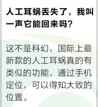 2019年4月10日這是一個(gè)新型的欄目<br /> 一本正經(jīng)地奇思妙想<br /> 內(nèi)容全靠一張圖<br /> 言語僅僅三兩句<br /> 大家隨便看看就行了<br /> 可一定得往心里去啊<br /><br /></span><div style="text-align: center;"><img src="/upfiles/20190410093258759.jpg" alt="" /></div> 嚴(yán)肅點(diǎn):幾乎每個(gè)月,都有人工耳蝸丟失的事件發(fā)生,每一次都會(huì)成為該地方新聞的焦點(diǎn)。<br /> 無論我們多么小心,不經(jīng)意間的疏忽總會(huì)造成大麻煩。對(duì)于遺失耳蝸的家庭來說,一方面要承擔(dān)一筆不少的購機(jī)費(fèi)用,另一方面會(huì)有一段時(shí)間的“聽力真空期”,我們不禁感嘆,要是耳蝸能自己報(bào)告位置就好了。<br /> 實(shí)際上這并非空想,國際某品牌人工耳蝸的最新設(shè)備已經(jīng)可以實(shí)現(xiàn)遺失位置定位,通過手機(jī),我們可以找到處理器所在的大致位置(如果你有興趣,可以留言交流)。<br /> 5G時(shí)代,萬物互聯(lián),遺失定位也是未來人工耳蝸產(chǎn)品設(shè)計(jì)的趨勢之一,未來小伙伴們就可以體驗(yàn)這種技術(shù)啦。<br /> 相關(guān)推薦閱讀:<a href="http://www.milwaukeetvs.com/listDetail.aspx?id=102609" target="_blank"><strong><span style="color:#3333ff;">保如果世界上沒有聽力設(shè)備:助聽器和耳蝸。</span></strong></a><br /><br /><br /> 聽覺有道助聽器價(jià)格:http://www.milwaukeetvs.com/products.html<br /><br /><br /> 發(fā)布于2019年4月10日 星期三<br /> 上午9:33分" />
