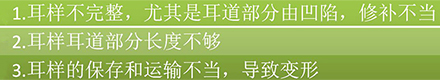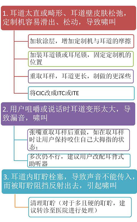 助聽器的嘯叫一直是困擾用戶和驗配師的主要問題之一,其中定制機的嘯叫問題尤其突出。</p><p> 定制機是根據病人的聽力狀況和耳道形狀定制的,每一臺的制作都是獨一無二的,因此出現嘯叫的原因也比標準制作過程的耳背式助聽器復雜得多,有些定制機甚至多次重做仍然不能排除嘯叫。</p><p> 但無論如何只要我們客觀、理智地對待嘯叫問題,找出癥結之所在,對癥下藥,那么減少甚至避免嘯叫的也并非難事。</p><p> 什么是嘯叫?</p><p> 所謂嘯叫就是助聽器發出刺耳的連續尖叫聲,術語上我們稱之為聲反饋,它可能是聲音反饋或電路上的正反饋。</p><p> </p><center><img alt="" src="/upfiles/201905070200484006.png" width="440" height="250" /></center><p></p><p> 內部嘯叫和外部嘯叫</p><p> 嘯叫分內部嘯叫和外部嘯叫兩種。外部嘯叫主要是定制機外殼或耳背機耳模與耳道不密封引起的,而其它原因引起的嘯叫可稱為內部嘯叫。</p><p> </p><center><img alt="" src="/upfiles/201905070200528641.png" width="440" height="250" /></center><p></p><p> 區分內部嘯叫和外部嘯叫</p><p> 區分內部和外部嘯叫時必須用聽筒,驗配師用聽筒連接到用戶反映有嘯叫的助聽器的出聲孔,可用橡皮泥密封接口和通氣孔,不使聲音泄漏出來,然后從聽筒內聽助聽器的輸出聲,若仍有嘯叫則說明助聽器有內部嘯叫,否則說明助聽器只有外部嘯叫。</p><p> 內部嘯叫的原因和排除</p><p> 內部嘯叫的主要原因有:</p><p> </p><center><img alt="" src="/upfiles/20190507020058626.png" width="440" height="250" /></center><p></p><p> 為了防止助聽器出現內部嘯叫,除了助聽器廠家對產品制作和檢驗把好關,對于驗配師和用戶來說,需要特別注意兩點:</p><p> </p><center><img alt="" src="/upfiles/201905070201041323.png" width="440" height="100" /></center><p></p><p> 外部嘯叫的原因和排除</p><p> 絕大部分用戶抱怨的定制機嘯叫是指外部嘯叫,外部嘯叫的原因和處理方法非常復雜,從定制機的整個驗配過程來看,我們可以將這些根原歸納到下面四大類:</p><p> 1.耳道</p><p> 耳道的客觀情況是產生嘯叫的主要原因,其可能引起嘯叫的原因及解決方法如下:</p><p> </p><center><img alt="" src="/upfiles/201905070201091323.png" width="482" height="780" /></center><p></p><p> 2.耳樣(印模)</p><p> 耳樣是定制機外殼制作的原型,耳樣的好壞直接影響到外殼完成后的密封性和舒適度,病人的聽力損失越重,對耳樣的要求也越高。在耳樣這一環節的如下情況將導致定制機嘯叫:</p><p> </p><center><img alt="" src="/upfiles/201905070201157387.png" width="440" height="80" /></center><p></p><p> 取耳樣是驗配師的基本功,必須在充分檢查耳道基礎上,膽大心細地取到合格的耳樣。</p><p> 3.選配和調試</p><p> </p><center><img alt="" src="/upfiles/201905070201216863.png" width="440" height="250" /></center><p></p><p> 選配最重要的就是做好外形和功率的平衡,不要為拉定單而勉強選配,如果用戶需要加大音量至幾乎滿檔才能使用,就容易出現嘯叫。</p><p> 助聽器增益設置(通過音量電位器或驗配軟件設置)的理想位置應該是在滿檔增益的二分之一到三分之二之間。</p><p> </p><center><img alt="" src="/upfiles/201905070201277561.png" width="440" height="250" /></center><p></p><p> 任何機型都有其選配范圍,如果超出此選配范圍,要讓助聽器始終在滿負荷下工作,即使沒有嘯叫,助聽器的失真、噪音等也會增加很多。</p><p> 因此選配合適的機型、線路和矩陣比重做外殼更合理、有效。</p><p> </p><center><img alt="" src="/upfiles/201905070201336863.png" width="440" height="250" /></center><p></p><p> 需要特別注意的是:價格單上的參考驗配范圍是指中高頻的值,但低頻一般會低20dB 左右,所以僅僅平均增益小于參考驗配范圍并不能保證每個頻率點都在驗配范圍內。</p><p> 加通氣孔是讓病人配戴更舒適的方法之一,但有時它也是產生嘯叫的禍首,此時減小甚至于堵塞通氣孔往往能立竿見影。堵塞氣孔可以用棉花或印模膏。</p><p> 對于一些中高檔機型帶反饋抑制功能的線路,可以設置反饋抑制的力度更大,一些輕微的嘯叫就能立刻消除。</p><p> </p><center><img alt="" src="/upfiles/201905070201384912.png" width="440" height="120" /></center><p></p><p> 4.制作</p><p> 關于定制機制作中避免外部嘯叫主要是助聽器廠家工程師需要嚴格把關,如果僅僅是定制機和耳道有輕微的不密封,可以加涂光亮漆或軟涂層處理,現場的維修中心技術員可以提供這一快速服務。</p><p> 需要重做時,必須由經驗豐富的制作人員綜合驗配師提供的信息和上次制作的記錄作出針對性措施。例如增加膨脹系數、加厚密封圈、加深耳道、調整出聲孔方向等。</p><p> 總之,定制機產生嘯叫的原因是多種多樣的,從取耳樣、選線路與矩陣直至制作,最后到調試和配戴,每一個環節處理不好都有可能產生嘯叫,只有抓好每個細節,才能最大可能地滿足病人,提高選配的成功率。</p><p> 更多詳情請登錄聽覺有道助聽器www.milwaukeetvs.com</p>" />