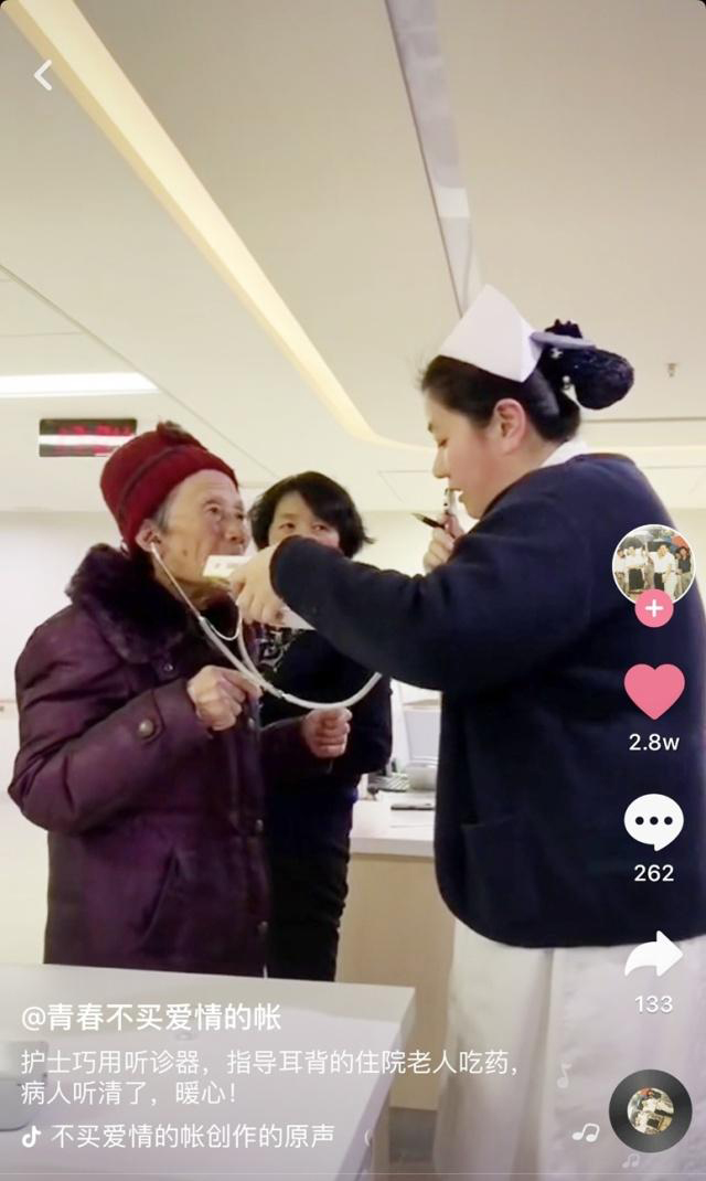 <span style="white-space:pre"> </span>“一天吃幾個呀?”<br /><br /> “一天三次,一次兩顆!”<br /><br /> “哦,一天三次,哦哦。”<br /><br /> 短短的三句話,15秒。<br /><br /> 一條護士用聽診器當“臨時助聽器”,為一位耳背老奶奶講解用藥方法的抖音視頻在網上熱傳。<br /><br /> 視頻中的老奶奶是住在醫院的79歲老人,有點耳背,用聽診器說話的是護士黃艷,拍攝者是另一位護士蔣夢婷。當時,老奶奶不知怎么吃藥,小黃喊了半天,奶奶也沒聽清,于是靈機一動,就把聽診器用上了。一旁的小蔣順手就把視頻分享到微信朋友圈里。<br /><br /> 友好醫院工作人員把這段視頻做成一條抖音視頻,以網名“青春不買愛情的帳”發送?!扒啻翰毁I愛情的帳”說,本來就想與同事和朋友分享一下醫院護士既機智又暖心的行為,沒想到僅一天的工夫,竟獲百萬點擊量,數萬個贊。<br /><br /> “看到節節飆升的點擊量,我非常激動?!薄扒啻翰毁I愛情的帳”說,可以看出人們對醫護人員這個行業的關注。<br /><br /> “我們對老人一個小小的關愛行為,竟引起網友的強烈反響,可以看到我們社會充滿愛?!?lt;br /><br /> 除了熱情點贊,還有不少網友發表了評論。<br /><br /> “給這個職業的工作者點贊,她們的真的很偉大,也很不容易?!?lt;br /><br /> “最美護士!”<br /><br /> “太贊了,真是暖心一幕。”<br /><br /> “這個職業工作者不容易,為這個護士姐姐點贊?!?lt;br /><br /> 還有的網友打趣,表示學到了一招:“太有才了,聽診器開發出新用途?!?lt;br /><br /></span><p><span style="font-size:16px;"> “對這個可以。心臟不好的聽心臟;肺不好了聽肺;嗓子不好了,可以當喇叭使;耳朵不好了可以當助聽器?!?lt;/span></p><p style="text-align: center;"><span style="font-size:16px;"><img src="/upfiles/201907240350126074.jpg" alt="" /><br /></span></p>" />