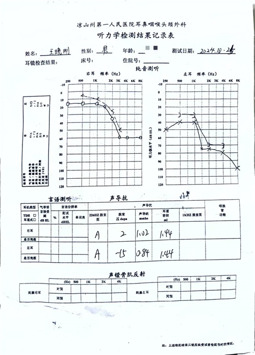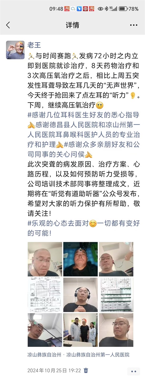 在這個快節(jié)奏的世界里,每一個細(xì)微的聲音都承載著生活的溫度。然而,突如其來的聽力挑戰(zhàn),卻讓這份美好變得模糊。<br /><br /><br />聽覺有道全國聽力連鎖聯(lián)合創(chuàng)始人王曉剛先生,期間或因工作過度操勞,于2024年10月16日的夜晚,耳道內(nèi)突然響起了一聲“砰”的異響。次日,他的耳內(nèi)又相繼出現(xiàn)了“噗噗”聲、“滋滋”聲的雜音,與人交談時,聽不清、甚至聽不到對方的話語變得愈發(fā)顯著。<br /><br /></span><p><span style="font-size:16px;">以下任何一項癥狀單獨或突發(fā)性耳聾的發(fā)病原因及發(fā)病機(jī)制尚不明確,多認(rèn)為與病毒感染、腫瘤性病變、自身免疫疾病、藥物中毒內(nèi)耳缺血等因素相關(guān)。<br />過度勞累,焦慮、精神壓力及相關(guān)心理因素等被認(rèn)為是常見的誘發(fā)因素。伴隨出現(xiàn),均有可能是突發(fā)性聾:<br />1、突然發(fā)生的主觀聽力下降(但是根據(jù)聽力損失的程度以及頻率不同,不是所有的病人都有聽力下降的感覺)<br /><br /><br />2、耳鳴(約90%)<br /><br /><br />3、耳悶脹感(50%以上)<br /><br /><br />4、眩暈、惡心、嘔吐(30%~50%)<br /><br /><br />5、聽覺過敏或重振(表現(xiàn)為對聲音異常敏感或者異常遲鈍,導(dǎo)致刺耳感或者失真感)<br /><br /><br />6、耳周感覺異常:(如麻木感、針刺感等不適感覺(全聾患者常見))<br /></span></p><p><span style="font-size:16px;">18日下午,當(dāng)他嘗試堵住右耳,竟發(fā)現(xiàn)左耳幾乎無法捕捉到外界的任何聲響。此刻,王總深刻意識到,自己的聽力出現(xiàn)了嚴(yán)重問題,于是立即趕往當(dāng)?shù)蒯t(yī)院耳鼻喉科進(jìn)行檢查,最終被確診為突發(fā)性耳聾。</span></p><p><br /></p><p style="text-align: center;"><img src="/upfiles/202411140426063076.jpg" alt="" /><br /></p><p><br /></p><p><span style="font-size:16px;">回想起發(fā)病初期,王總表示,當(dāng)自己突然失去聽力,完全與外界隔絕的那一刻,內(nèi)心充滿了無助與恐懼。幸運的是,由于他長期深耕聽力行業(yè),對聽力受損有著較為深入的了解、明白:突聾聽力救治時間為黃金72小時內(nèi)。因此能夠識別癥狀并及時就醫(yī),從而得到了有效的治療。<br /><br /><br />然而,如今仍有許多患者對聽力健康的信息了解不足,錯過了最佳的治療時機(jī),最終形成不可逆的聽力損傷,給日常生活、工作中帶來嚴(yán)重交流障礙。</span><br /></p><p><br /></p><p style="text-align: center;"><img src="/upfiles/202411140428078193.jpg" alt="" /><br /></p><p style="text-align: center;"><img src="/upfiles/202411140429087669.jpg" alt="" /><br /></p><p style="text-align: center;"><img src="/upfiles/202411140429178890.png" alt="" /><br /></p><p style="text-align: center;"><br /></p><p style="text-align: center;"><span style="font-size:16px;color:#ff9900;"><strong>什么是突發(fā)性耳聾?</strong></span></p><p style="text-align: center;"></p><div style="text-align: left;"><span style="font-size:16px;">醫(yī)學(xué)全名:突發(fā)性不明原因性聽力損失。</span></div><span style="font-size:16px;"></span><div style="text-align: left;"><br /></div><div style="text-align: left;"><br /></div><div style="text-align: left;">簡稱:突聾</div><div style="text-align: left;"><br /></div><div style="text-align: left;"><br /></div><div style="text-align: left;">根據(jù)中國2015年版《突發(fā)性聾診斷和治療指南》,突發(fā)性耳聾目前定義為:是指72小時內(nèi)突然發(fā)生、原因不明的感音神經(jīng)性聽力損失,至少在相鄰的兩個頻率聽力下降≥20dBHL。</div><div style="text-align: left;"><br /></div><div style="text-align: left;"><br /></div><div style="text-align: left;">近年來“突發(fā)性耳聾”患者年輕化趨勢明顯,年輕人患病比例增加了三至四成。耳蝸中的聽覺毛細(xì)胞一旦受損,在一定時間內(nèi)得不到及時治療,將不能再生。</div><div style="text-align: left;"><br /></div><div style="text-align: left;"><br /></div><div style="text-align: center;"><strong><span style="color:#ff9900;">臨床表現(xiàn)</span></strong></div><p></p><p><span style="font-size:16px;">突聾一般單側(cè)發(fā)病,個別情況下可以雙側(cè)發(fā)病( 1/10雙側(cè));</span><br /></p><p><span style="font-size:16px;"><br /></span></p><p style="text-align: center;"><span style="font-size:16px;color:#ff9900;"><strong>原發(fā)狀態(tài)</strong></span></p><p><span style="font-size:16px;">以下任何一項癥狀單獨或伴隨出現(xiàn),均有可能是突發(fā)性聾:<br />1、突然發(fā)生的主觀聽力下降(但是根據(jù)聽力損失的程度以及頻率不同,不是所有的病人都有聽力下降的感覺)<br /><br /><br />2、耳鳴(約90%)<br /><br /><br />3、耳悶脹感(50%以上)<br /><br /><br />4、眩暈、惡心、嘔吐(30%~50%)<br /><br /><br />5、聽覺過敏或重振(表現(xiàn)為對聲音異常敏感或者異常遲鈍,導(dǎo)致刺耳感或者失真感)<br /><br /><br />6、耳周感覺異常:(如麻木感、針刺感等不適感覺(全聾患者常見))<br /></span></p><p><span style="font-size:16px;"><br /></span></p><p style="text-align: center;"><span style="font-size:16px;color:#ff9900;"><strong>繼發(fā)狀態(tài)</strong></span></p><p><span style="font-size:16px;">恐懼,焦慮;耳鳴帶來的心理、睡眠干擾等,嚴(yán)重影響生活質(zhì)量。<br /></span></p><p><span style="font-size:16px;"><br /></span></p><p style="text-align: center;"><span style="font-size:16px;color:#ff9900;"><strong>誘發(fā)因素</strong></span></p><p><span style="font-size:16px;">突發(fā)性耳聾的發(fā)病原因及發(fā)病